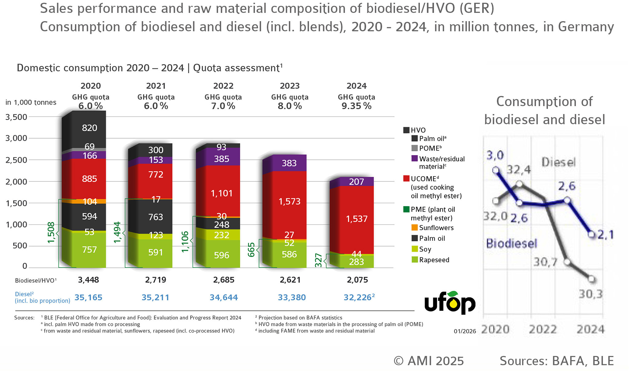 According to information from the Federal Office for Agriculture and Food (BLE), just over 3.6 million tonnes of biofuels (previous year: 3.9 million tonnes) were marketed in 2024 and were counted towards greenhouse gas (GHG) reduction requirements. Of this, approximately 2.075 million tonnes were diesel-replacing biofuels (biodiesel and HVO), a significant decrease from the previous year (2.621 million tonnes). The drop was due to the high share (82 per cent) of biofuels derived from waste oils and fats. The benefit of these feedstocks is that they are included in the GHG balance calculation with a GHG value of 0 g CO2. Depending on the price, the high GHG saving performance makes these feedstocks ideal for mineral oil companies that are subject to quota obligations. The shares of biofuels from rapeseed oil and soybean oil decreased accordingly to approximately 15 per cent and about 2 per cent respectively.