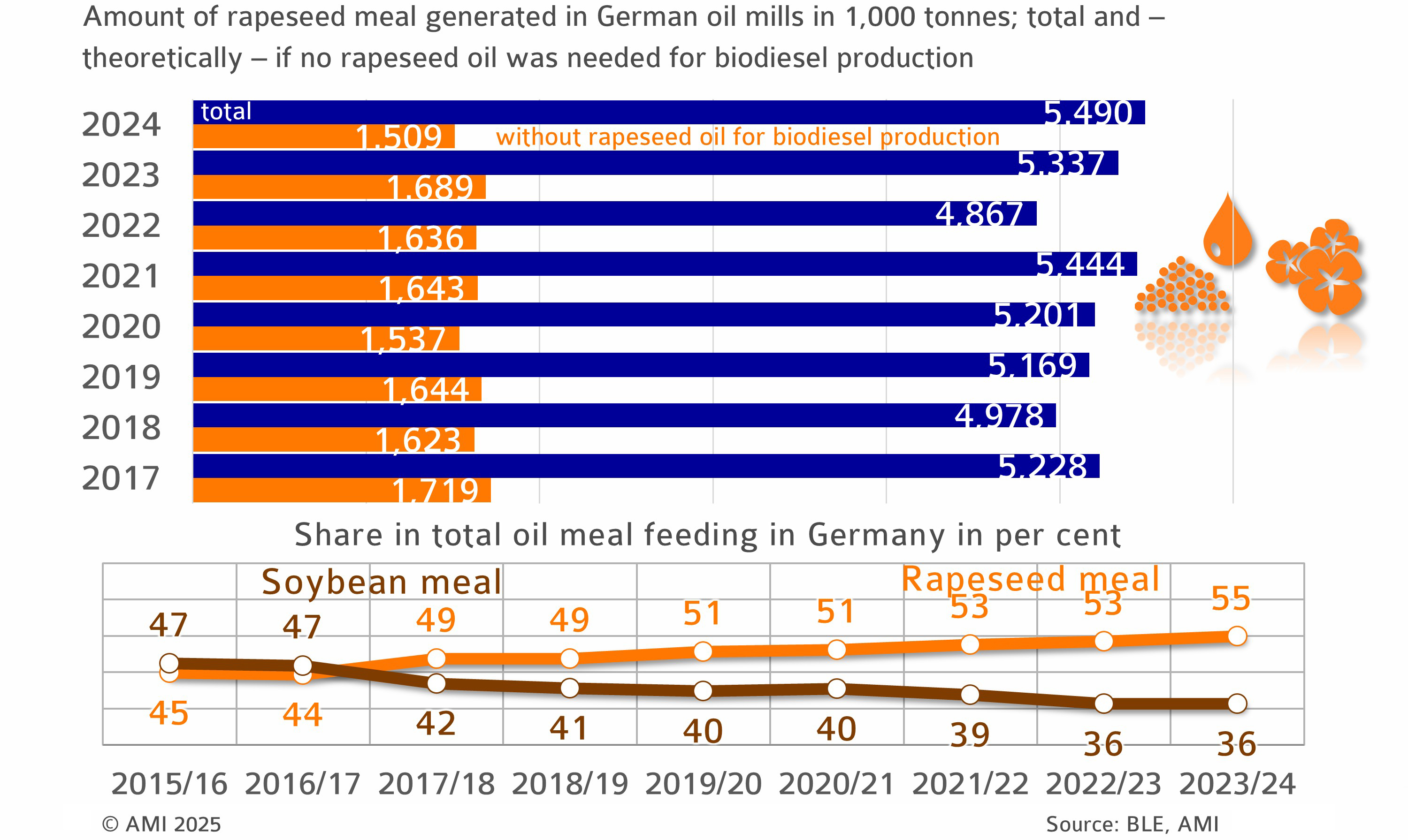 The feed market benefits significantly from biodiesel production, because rapeseed meal is generated as a by-product of rapeseed oil production. In 2024, German oil mills processed just under 9.8 million tonnes of rapeseed, yielding 4.3 million tonnes of rapeseed oil and 5.5 million tonnes of rapeseed meal. Rapeseed varieties in Europe are exclusively bred without genetic modification (GM) and only licensed if developed without GM, which means that the byproduct rapeseed meal is also GM-free. This fact encourages the use of rapeseed meal, especially in dairy feed, where it can fully replace soybean meal. The key factor is demand for dairy products that qualify as “without GM”. This demand encourages regional production and processing of rapeseed. At the same time, it reduces reliance on imports of soya and soybean meal.