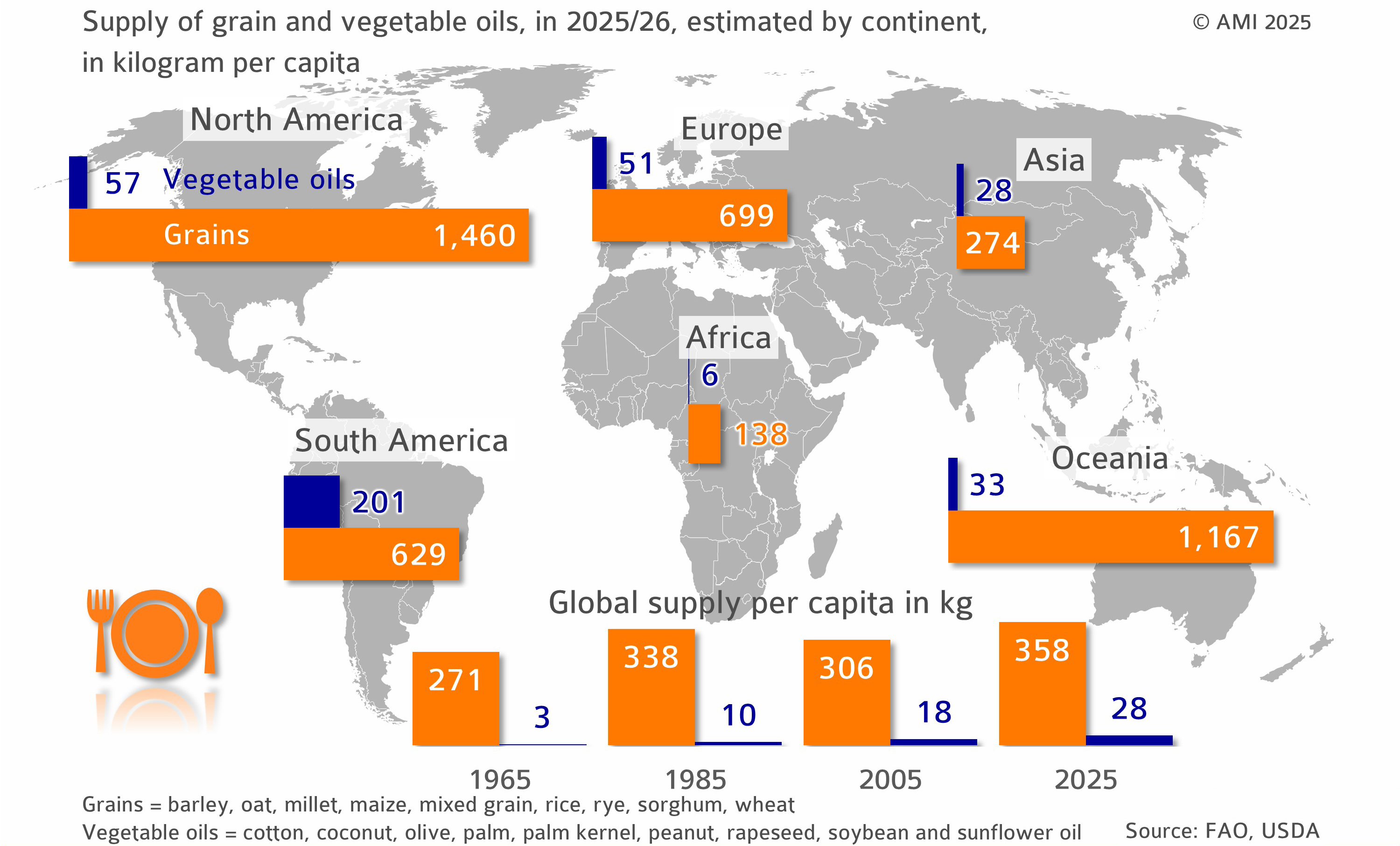 For 2025/26, global per capita supply is expected to reach 358 kg in the case of grain and 28 kg in the case of vegetable oils. In other words, supply is projected to be well above the level recorded 20 years ago. The figures include the use of grain and vegetable oils for food, feed, biofuels, and other industrial purposes. It should be noted that feedstock intended for biofuel production can be diverted to other uses such as human nutrition at any time, if and when necessary. At the same time, the joint products generated in biofuel production, such as soybean meal and rapeseed meal, make an outstanding contribution towards producing high-quality food, thus reducing demand for meat or feedstuffs from other production regions. Production and use of oilseeds should be assessed in a holistic manner, taking into account their contribution towards food security, higher value added, and biodiversity. This is, in essence, the concept of a networked bioeconomy in action.