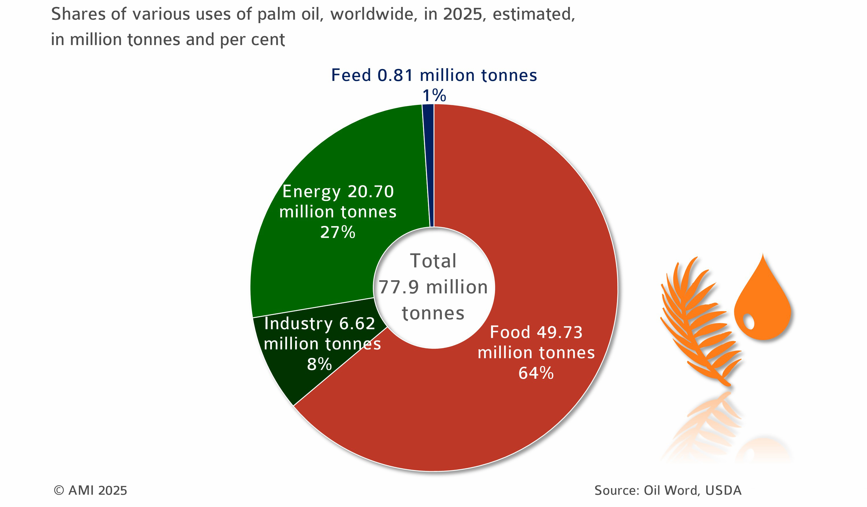Oil palm is the single most important oleaginous fruit crop in Southeast Asia, but it is also grown to a considerable extent in Colombia and Nigeria. Palm oil is the most important vegetable oil in the world, with annual production reaching around 80 million tonnes. Like other vegetable oils, palm oil has a wide range of uses: in 2025, food uses accounted for 64 per cent, the power sector (biofuels) for 27 per cent, industrial applications for 8 per cent and feed for 1 per cent. Global consumption of palm oil totalled approximately 77.9 million tonnes in 2025, most of which comprised edible oils used in Asia.