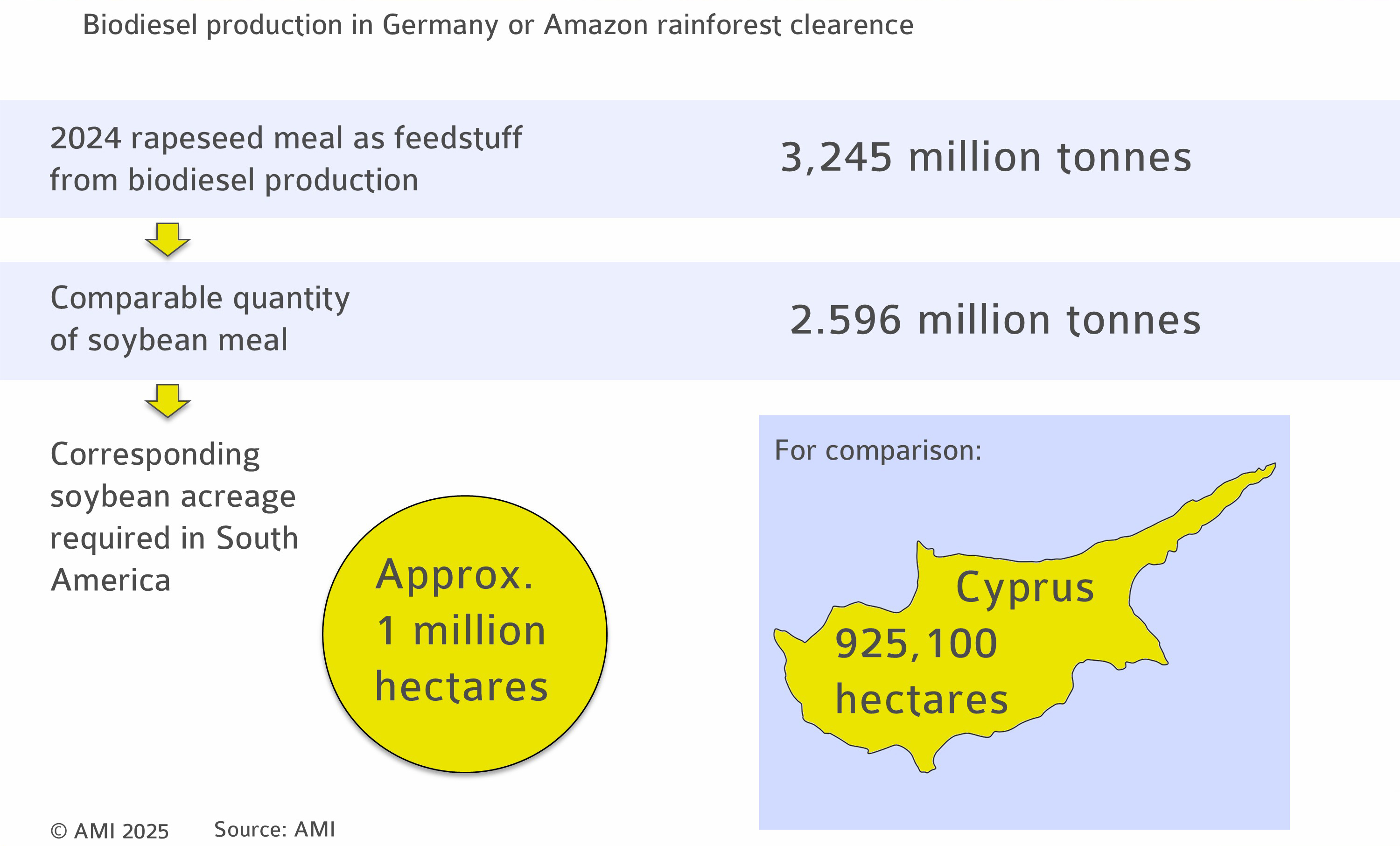 The production of biodiesel is a key factor driving this supply. Just over 3 million tonnes of rapeseed meal were generated as a joint product in Germany in 2024. If demand for rapeseed oil for biofuels were to be reduced due to political decisions, domestic supply of rapeseed meal would decline accordingly. However, the latter is urgently needed, as Germany's annual demand for oilseed meals amounts to 7.5 to 8 million tonnes. With no demand from biodiesel producers, there would be a shortage of nearly 2.6 million tonnes of soybean meal equivalents that would have to be imported. This would represent an additional soybean area of approximately 1 million hectares in South America – an area roughly the size of Cyprus. This pressure on land increases the risk of further deforestation in ecologically sensitive regions.
