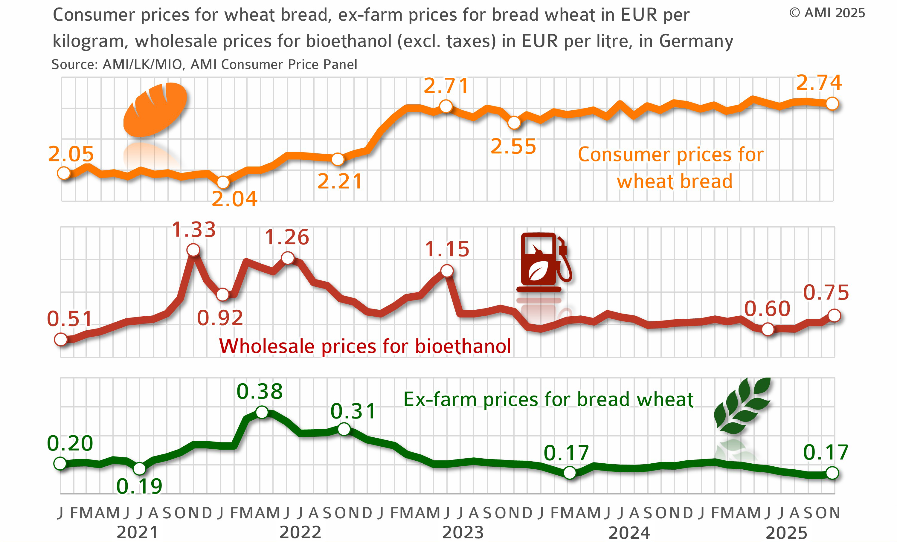 Wheat is used to produce both food and bioethanol. It has been repeatedly claimed that biofuel production causes a shortage in grain supply for food purposes, which in turn leads to higher prices. The development of prices for wheat and rye bread disproves this belief. Bread prices follow their own specific market mechanisms and are influenced by other price-driving factors such as wage levels, energy costs, etc. Farmers feel under pressure to adjust production volumes because producer prices for wheat are sometimes below production costs. There is therefore a need for additional marketing alternatives to support prices and secure farmers' incomes.