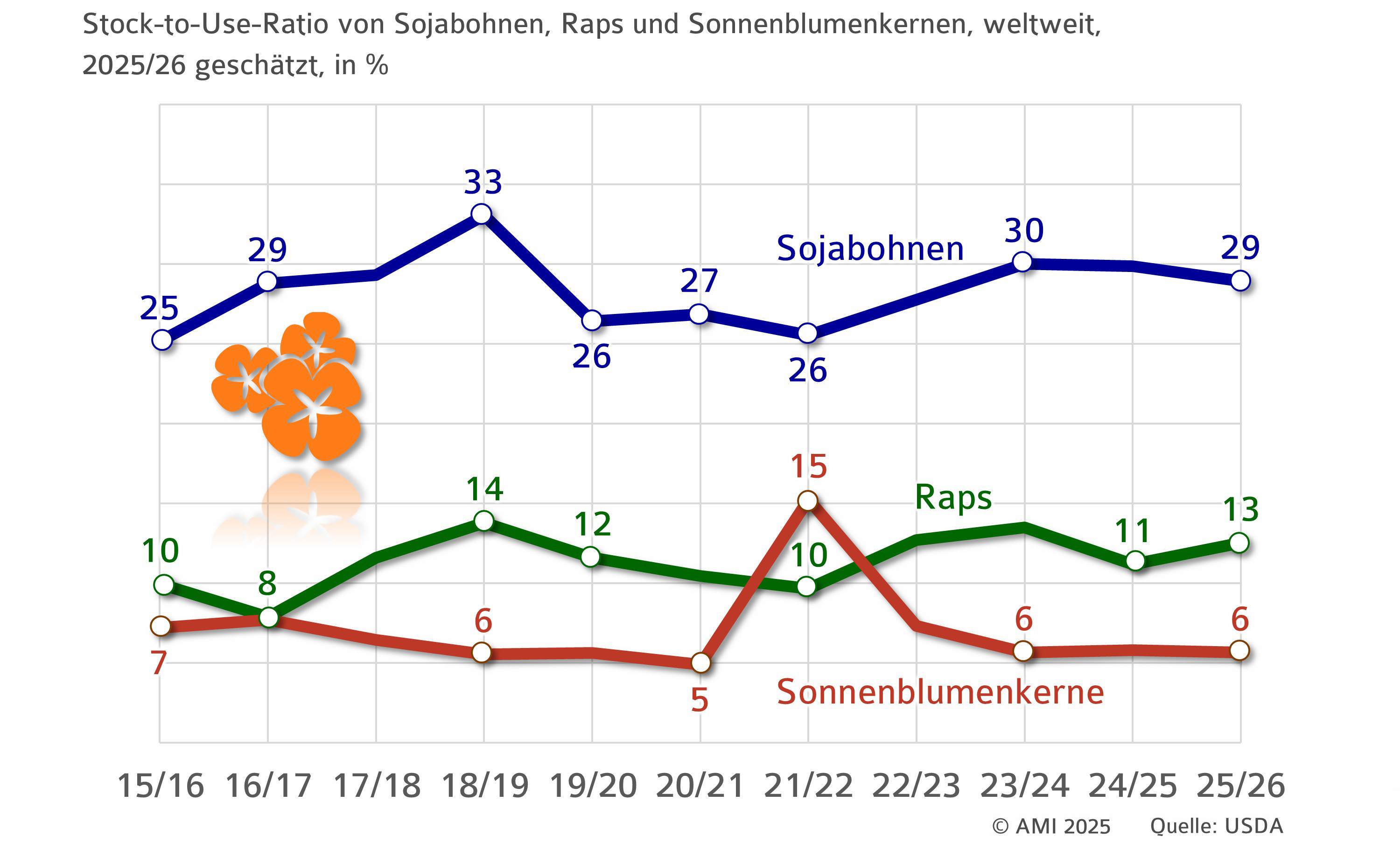 Für Sojabohnen wird 2025/26 trotz hoher Erzeugung ein leichter Rückgang der Vorräte erwartet. Grund ist ein weiter zunehmender Verbrauch. Insbesondere der wachsende Bedarf an Sojaprotein in China führt zu einem Absinken des Wertes auf voraussichtlich 29 %.