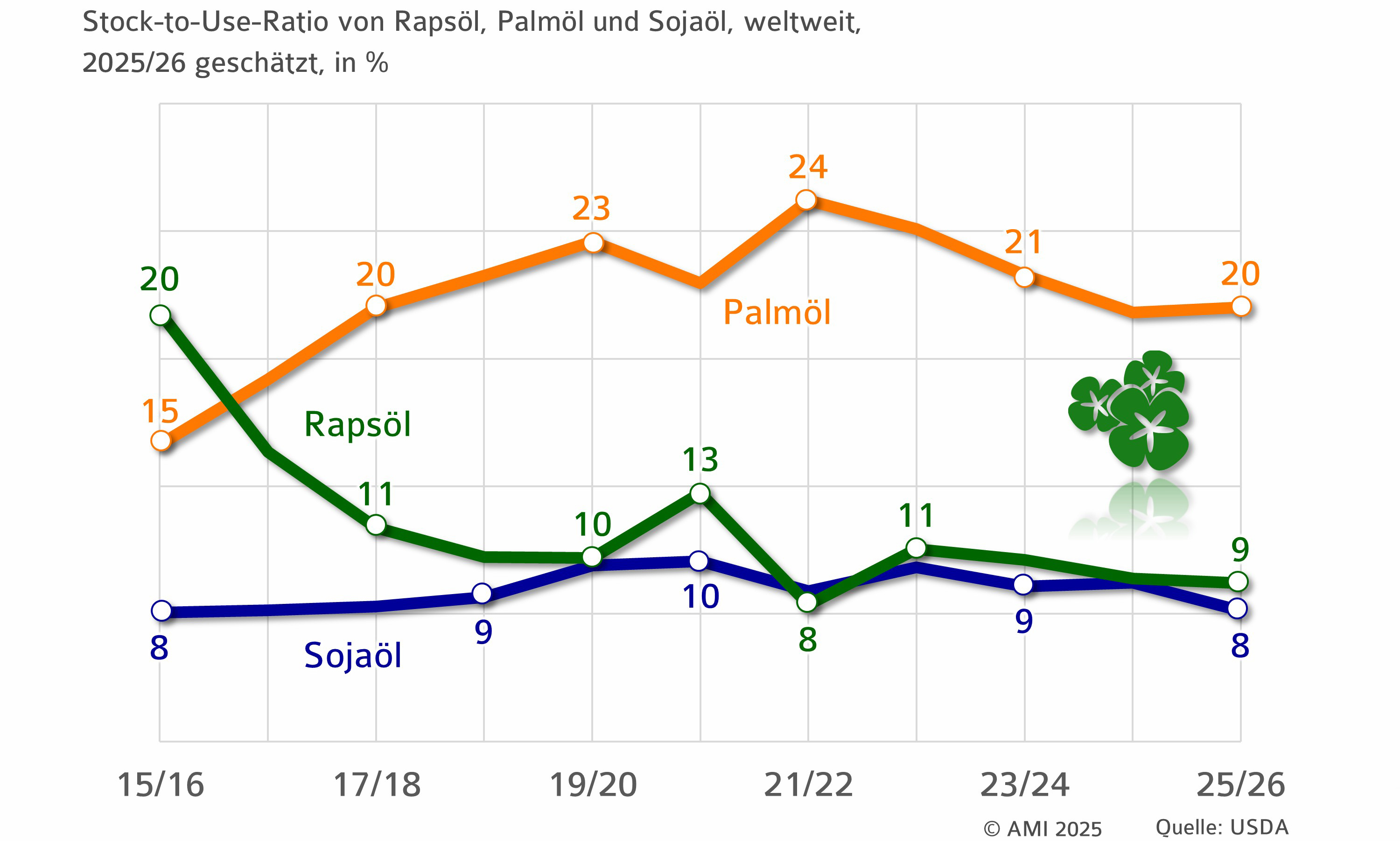 Die Versorgung mit Raps fällt 2025/26 deutlich großzügiger aus. Nach einem Anstieg der globalen Erzeugung liegt die Stock-to-Use-Ratio voraussichtlich bei 13 % und damit klar über dem Niveau des Vorjahres.