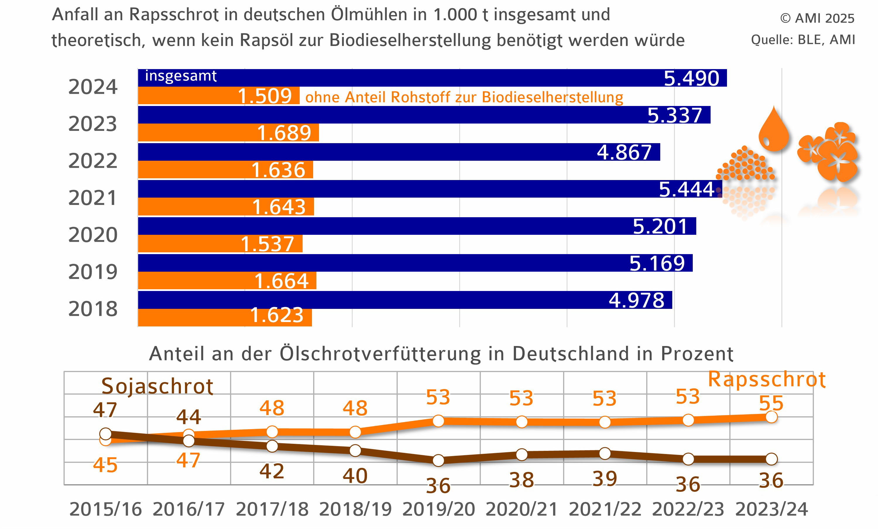 Rapsschrot deckt seit Jahren rund die Hälfte der in Deutschland eingesetzten Ölschrote. 2023/24 lag sein Anteil sogar bei 55 %, während Sojaschrot sich auf niedrigem Niveau stabilisierte. Dies unterstreicht die wachsende Rolle von Rapsschrot als wichtigste heimische Eiweißquelle in der Tierernährung.