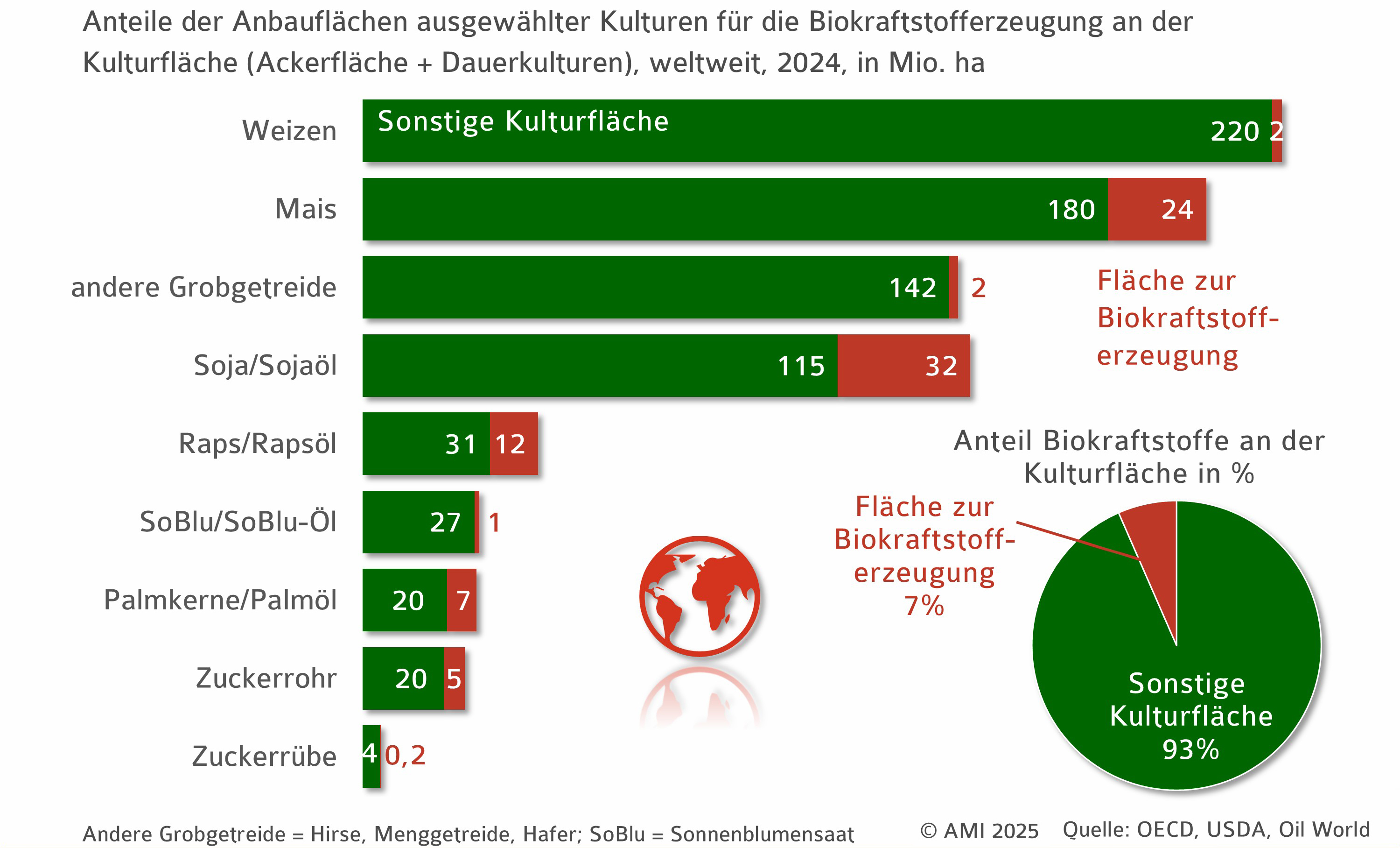 2024 wurden weltweit etwa 1,2 Mrd. ha mit Kulturpflanzen wie Getreide, Ölsaaten, Eiweiß-, Zucker- und Faserpflanzen sowie Obst, Gemüse und Nüssen bestellt. Der überwiegende Teil dieser Flächen dient direkt oder indirekt – über die Fütterung von Nutztieren – der Ernährung. Lediglich rund 7 % der Anbaufläche entfielen auf Rohstoffe für die Biokraftstoffproduktion.