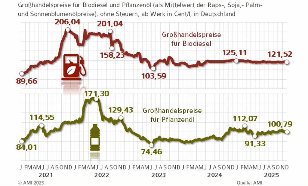 Seit 2023 steht der Biodieselmarkt unter Druck. Der Preisrückgang setzte sich 2024 fort. Diese für die gesamte Warenkette negativen Marktimpulse sind Folgen des Betruges mit UER-Zertifikaten (Anrechnung von THG-Minderungen bei der Erdölförderung) sowie von umfangreichen Importen vermeintlich fortschrittlicher Biokraftstoffe aus China. Zum Schutz der europäischen Biodieselindustrie führte die EU-Kommission Importzölle von 10 bis 35,6 % (je nach Unternehmen) ein. Die durch die rückläufigen Biodieselimporte erwartete Entlastung des Rohstoffmarktes bleib jedoch aus. Auf Rohstoffimporte (Abfallöle) aus China wird kein Zoll erhoben.