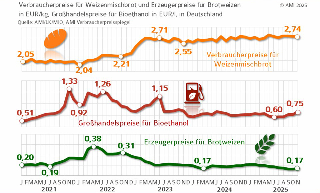 Die Preise für Bioethanol haben zuletzt etwas angezogen, liegen aber weiterhin deutlich unter den Höchstständen von Ende 2021. Insgesamt zeigt sich: Die Preisbildung am Brotmarkt wird maßgeblich von Verarbeitung, Energie-, Lohn- und Logistikkosten bestimmt, während die Rohstoffpreise – und damit auch die Bioethanolproduktion – nur einen geringen Einfluss haben.